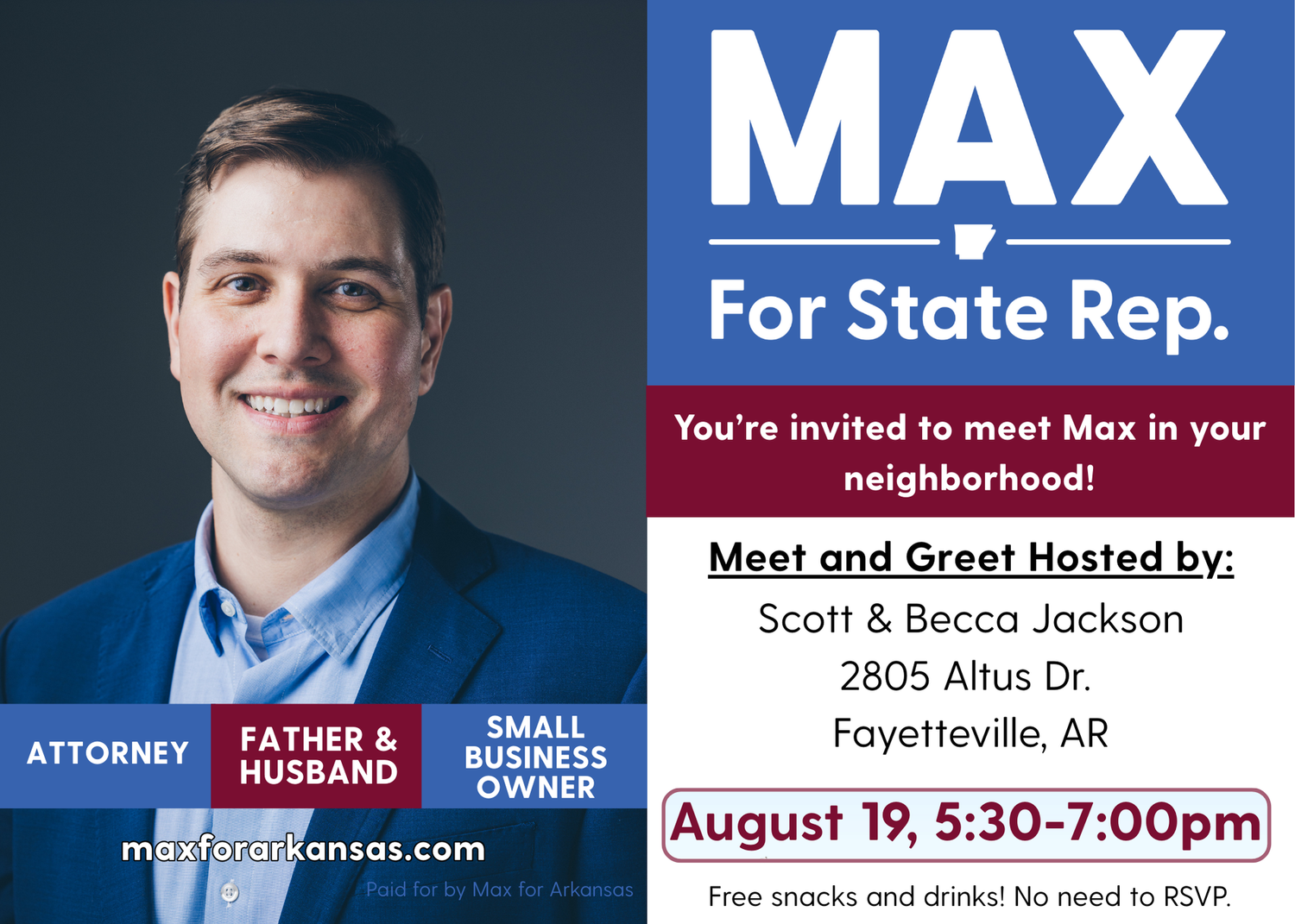 Join us for our campaign kickoff fundraiser on May 29 at 310 E. Fairway Lane, Fayetteville, Arkansas to meet Max and learn more about his campaign!